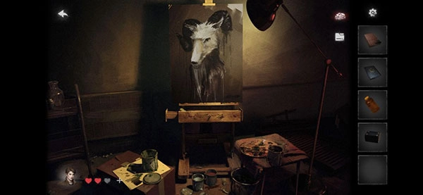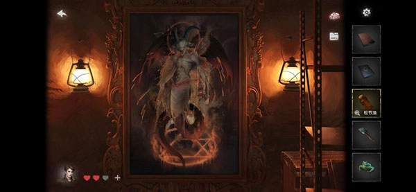 15、到房间中间的画像前,泼松节油,然后根据提示依次搞定蝙蝠、羊(刷子画上去)、蛇、青蛙(回水族箱吃掉虫子)。