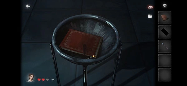 10、铁盆里放入相册和神秘瓶子的液体,用火烧掉,得到锥子。