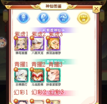 打开游戏首页右下角更多→天地通鉴→神仙图鉴,排在左边第1位的幻彩神仙就是幻彩一,第2位的就是幻彩二,第3位的就是幻彩三。