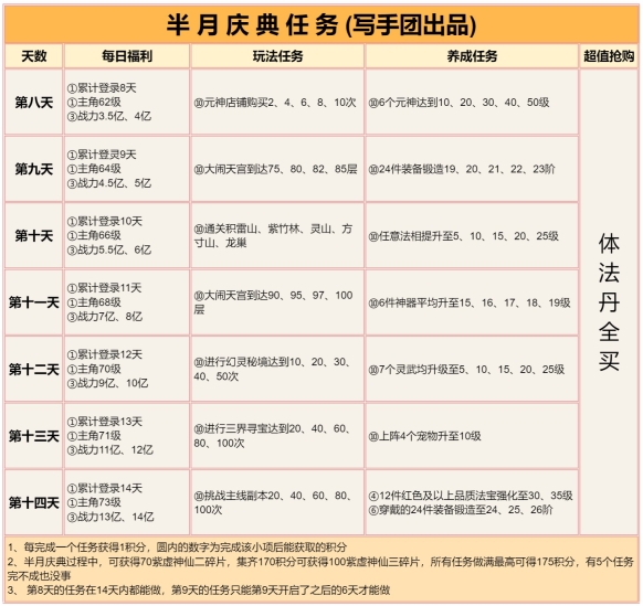 这游戏的新手村有10天,这10天内0氪/首充只用在商城体法丹每天买满+10个除魔令,某些玩法次数,vip礼包,这四个地方花元宝,多的全存着,等出村后的活动花。