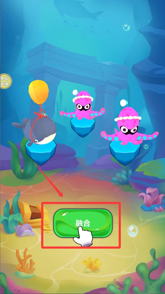4、当两只相同等级的章鱼相邻时,点击底部闪烁的"融合"按钮,它们会合体进化成更强大的黄金章鱼形态。