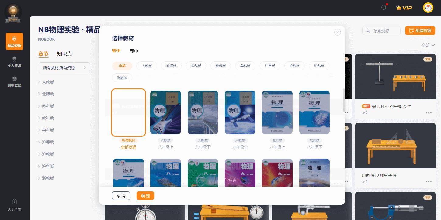 1. 在左上角选择相应的学段后,点击右上角的“新建资源”按钮,并选取对应的模块,这样就可以进入相关的实验界面了,比如物理电与磁模块。