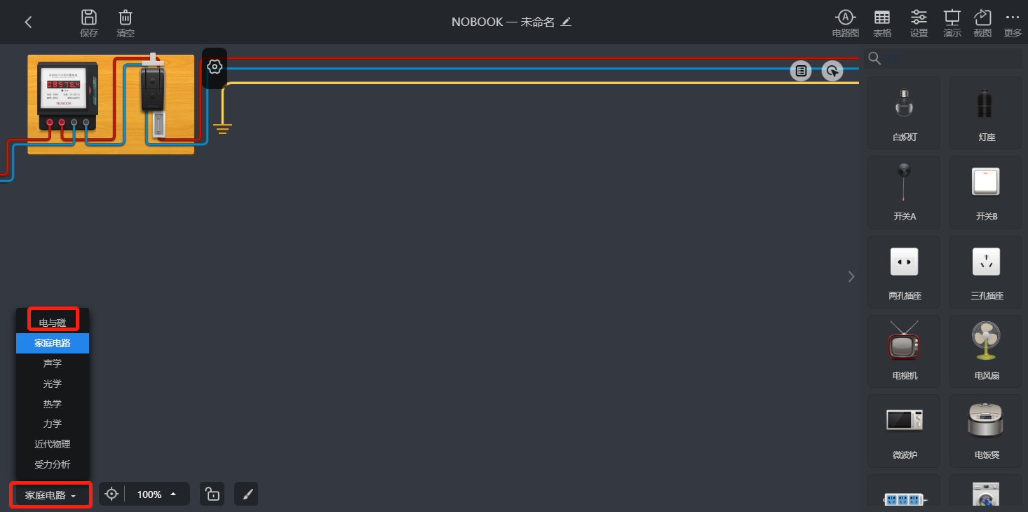 NOBOOK虚拟实验提供了丰富的优质资源,并支持多个实验模块的自主探索。比如,在物理学科中,可以探究力、热、声、光、电与磁、家庭电路、近代物理、力与运动以及受力分析这九大模块;在化学学科中,则可以探索无机化学和电化学模块。这些实验都可以通过自由组合来完成DIY探究。