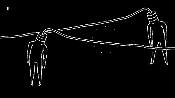 当我们完成后,接下来的画面会切换到两个头部直接连接着插头的人。这时,如果我们随意拉动其中一条线,就会发现两个人都被牵动了,仿佛这条线就像命运的红线一样,让两人缓缓地靠近彼此。