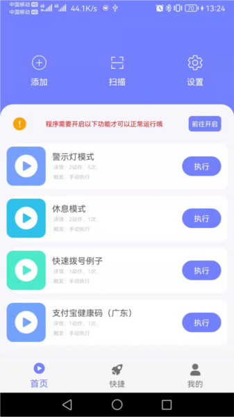 3、首页展示添加、扫描等功能入口,有警示灯模式等程序需开启功能运行,点击执行可启动对应模式,助力自动化操作。