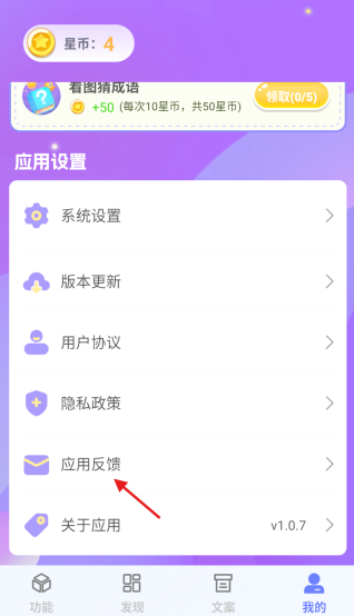 2、在个人中心页面向下滑动屏幕,找到并点击 “应用反馈” 选项,进入反馈界面。