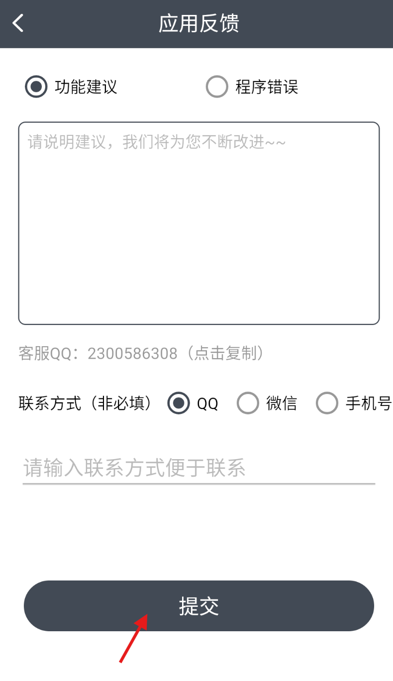 3、在反馈界面选择 “功能建议” 或 “程序错误” 类别,填写反馈内容和联系方式,点击 “提交” 按钮完成反馈。