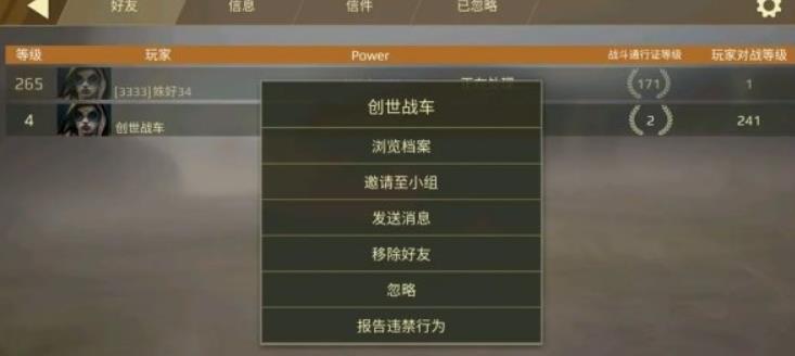 3、如下图所示:好友列表展示了你在游戏中添加的好友,并且会显示每位好友的总声望等级、当前使用战车的战斗力,以及在本期通行证中达到的等级等信息。