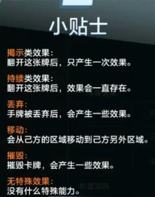 在你获得每张卡牌时,卡牌的左上方数字为能量,右上方数字为战力。每张卡牌都有着不同的效果。其中最主要的词条为:揭示,持续,丢弃,移动,摧毁及纯文本描述,这些词条解释如下: