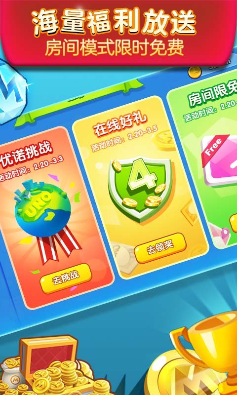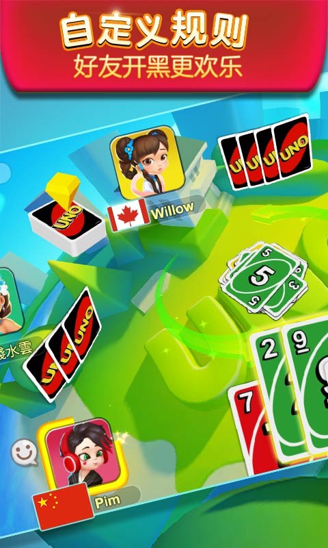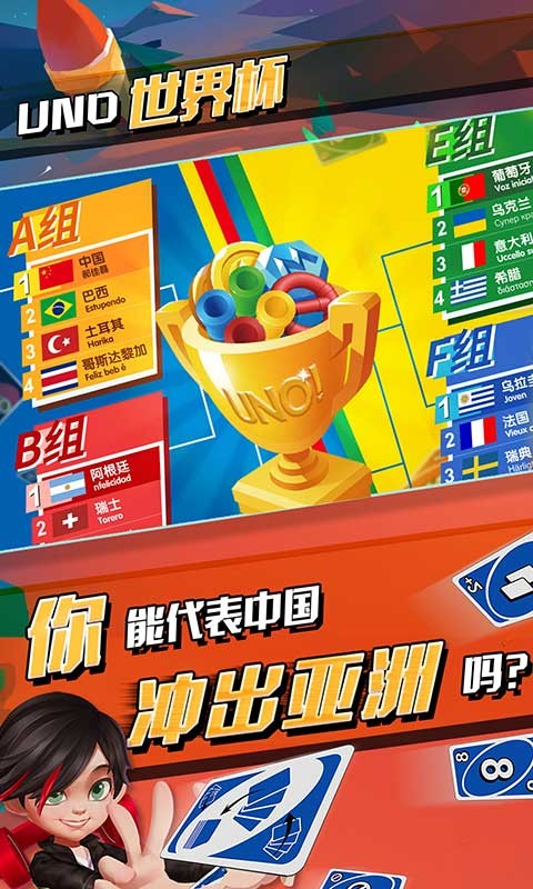 《一起优诺》是一款获得正版授权的UNO卡牌竞技游戏,玩家可以在手机上体验到UNO带来的乐趣。这款游戏让玩家享受到史上最流行的桌面游戏所带来的独特魅力。游戏中设计了一系列创新关卡,玩家可以代表自己的国家参加UNO世界杯比赛,与来自全球204个国家和地区的玩家一决高下,争夺最终的冠军荣誉。在游戏中为国争光,冲击最高荣誉。如果能够代表国家赢得冠军,还将在所在服务器开启全服庆祝活动,并且所有玩家都将获得奖励。快来加入这场激动人心的比赛吧!