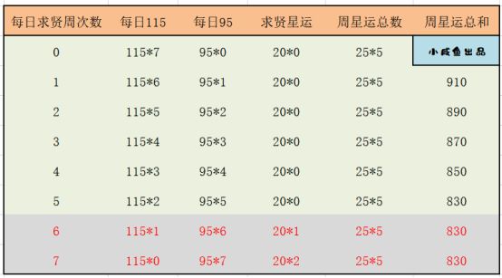 2结合每天和每周的状况,我们可以计算出每天获得星运的情况如下:
