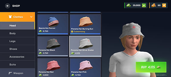 6、点击左侧的Clothes可以购买头饰、衣服、裤子、鞋子以及武器等装备。