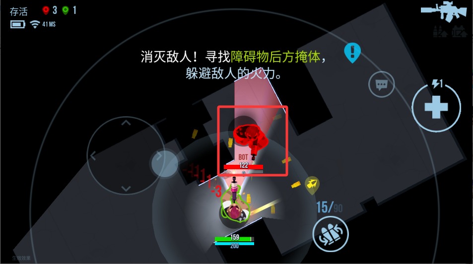 2、左手滑动控制角色走位,右手瞄准射击,边走边打最安全。躲掩体后面能减少中弹几率。