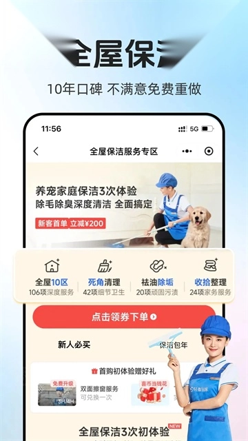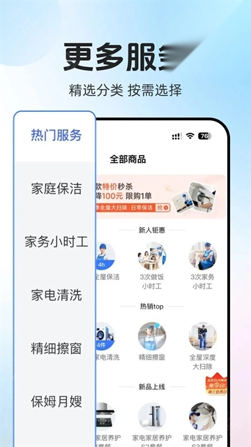 1、【保洁清洗服务项目】:涵盖日常保洁、收纳整理、擦玻璃、洗窗帘、深度保洁、开荒保洁以及全屋大扫除等。