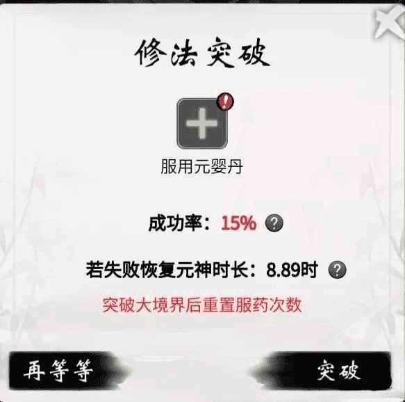 长按吐纳到红色箭头所处位置可随机获得2~10倍修为。突破到筑基的天劫很弱,不要浪费机缘买灵盾。