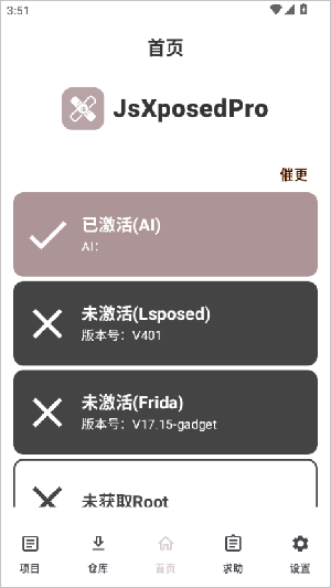 3、务必保证软件主页呈现“已激活(Lsposed)”“已激活(Frida)”“已获取Root”的状态,并且确认系统版本与之适配。