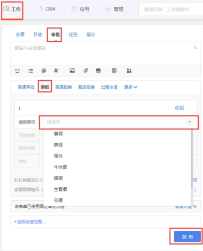 操作步骤:点击工作界面—审批—新建审批选择请假表单中的具体请假事项,如果企业有固定审批流程,则会按照设置好的流程进行流转;