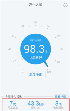 1. 打开本站的净化大师最新版本,进入主界面,此时就能看到当前系统的净化状态。页面底部展示了今日的净化记录,点击此处可进一步查看具体详情。