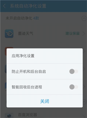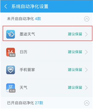 4、于系统的自动净化设置里,顶部会展示出尚未开启自动净化的软件列表,而下方呈现的是已经开启净化的软件列表。