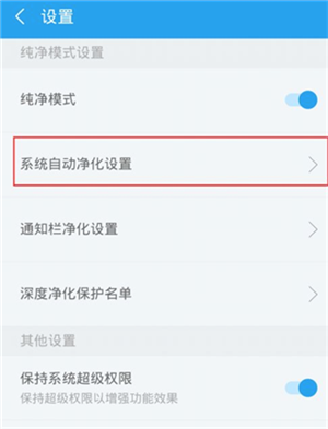 3、打开纯净模式后,会出现新的菜单项。点击进入“系统自动净化设置”。