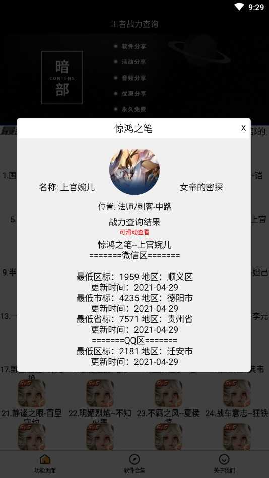 王者战力查询软件助力王者玩家,查询各省、市、县的王者荣耀相关信息。通过挑选竞争力较低的地区,玩家能够轻松获取王者称号!