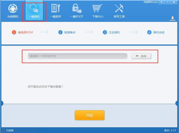 好后,点击一键刷机,添加刚才的rom包,点击开始。