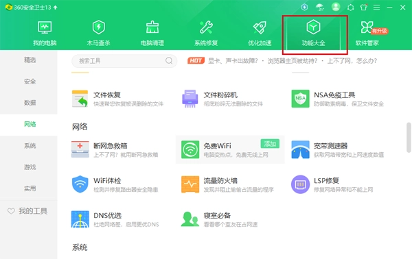 1第一步,在电脑上打开360安全卫士,接着在右下角的“功能大全”里,查看是否存在【流量防火墙】选项,要是没有,就点击其后方的【更多】。