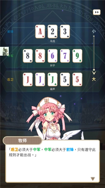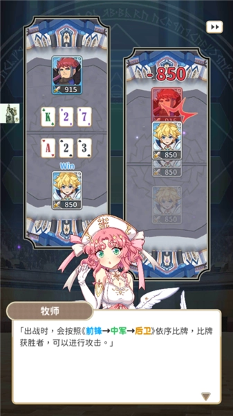 6、出战时,将依照《前锋→中军→后卫》的顺序依次比牌,比牌胜出者,能够展开攻击。