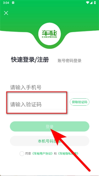 3、在快速登录注册界面,输入手机号,点击获取验证码按钮。