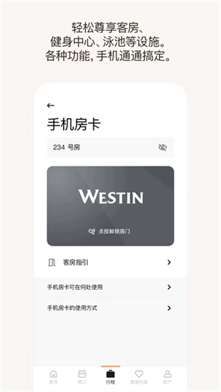 支持提前48小时手机登记入住,设置抵达时间并接收客房备妥提醒,生成手机钥匙开启客房及健身中心等设施,还可向3位伙伴分享钥匙,离店直接手机退房。