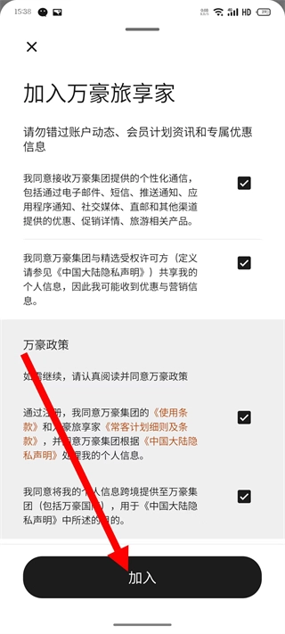 4、下滑页面,勾选同意相关政策条款后,点击页面底部的加入按钮,完成注册流程。
