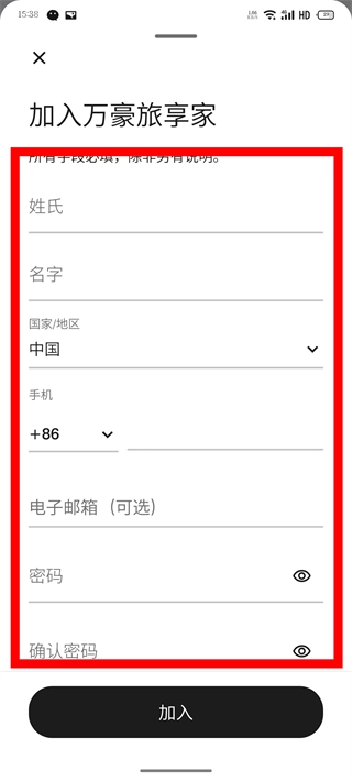 3、在加入万豪旅享家的注册页面,仔细填写姓氏、名字、等信息。