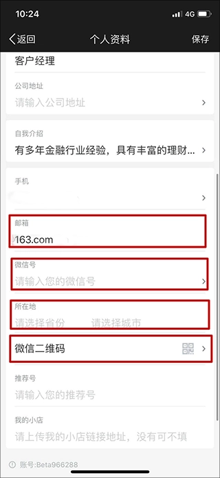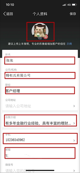 第四步:点击上方头像框进行头像设置,此头像将作为个人名片头像。接着,在下方输入姓名、单位、职位、自我介绍、联系方式等各类信息,以便客户能及时联系我们。
