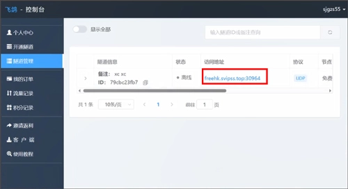 1、在飞鸽 - 控制台,针对【飞鸽内网穿透器】开通并设定一个穿透隧道,协议选择udp,端口设为7777 。