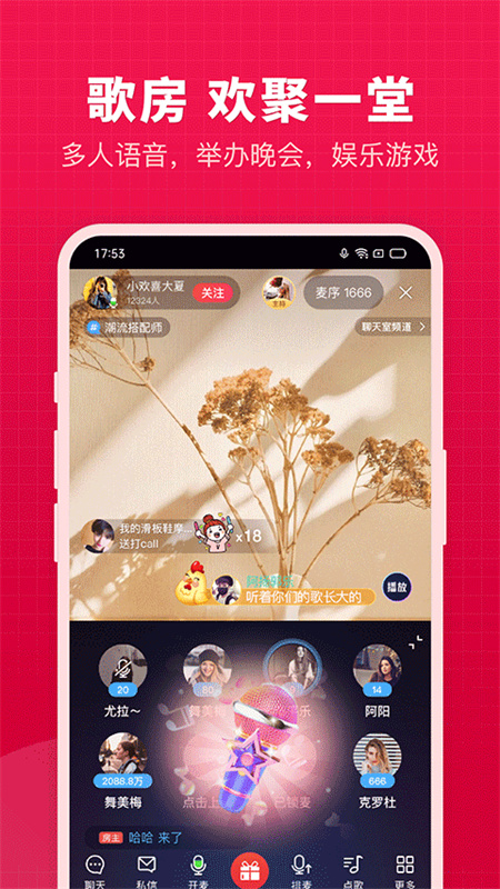 直播间:团战PK、你点我唱、福袋红包、心愿助力、互动表情、唱歌挑战多种玩法;