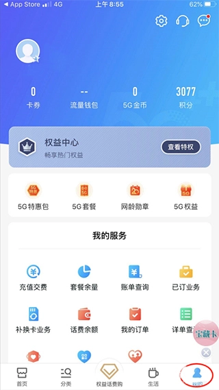 2、安装结束后登录营业厅,点击底栏我的进入到个人面板。如下图所示。