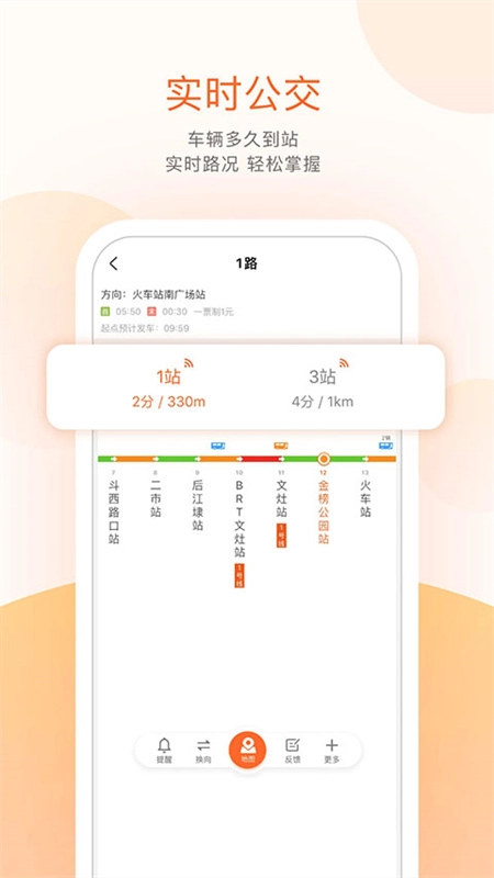 车来了车到哪了?公交车还有几分钟到?公交车还有多远?公交实时情况轻松掌握,还可预设响铃提醒。