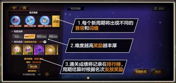 值得一提的是,噩梦斗场会记录每一位挑战者的成绩,并将其制作成排行榜来激励那些勇于挑战的勇士。噩梦斗场以七天为一周期,周期性地为排行榜上的挑战者结算奖励,而名列前茅的各位除了应得的奖励外,还将获得特殊称号。