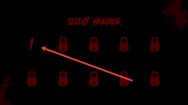 2、在“SELECT-HORROR”页,尝试解锁红箭头指向的恐怖内容,推进游戏剧情与玩法。