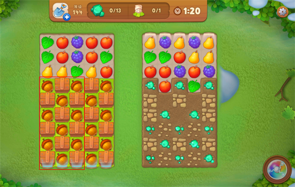 2、右侧无合适消除时,尝试左侧合成道具,逐步解除小矮人周围的阻碍。
