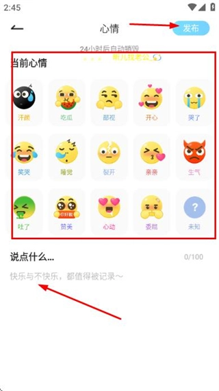 4、在心情编辑页面选择对应的表情,填写动态内容后,点击发布完成动态发布操作。