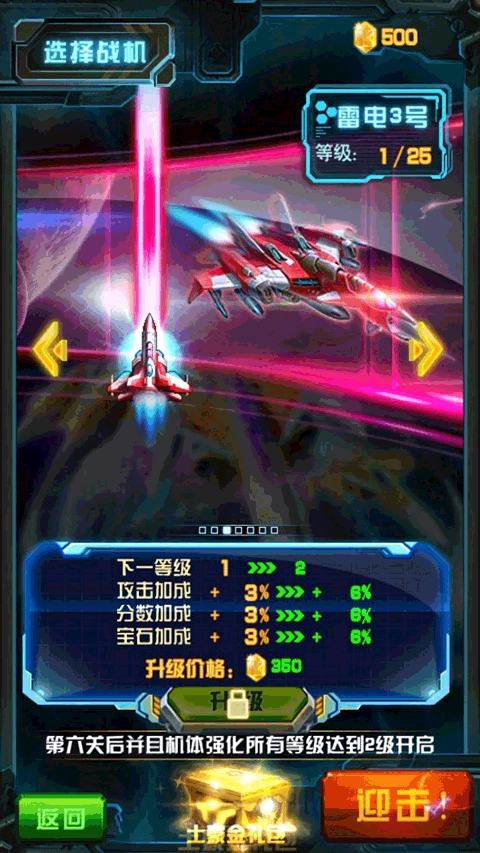 这款战机实用性不错,具备自动锁定敌人的功能和激光攻击模式,用来清理小怪很合适,在你拿到更高级的战机之前,它会是个挺棒的选择。