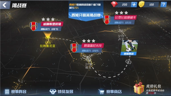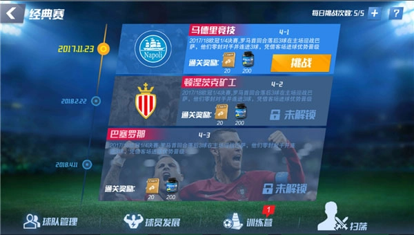 巡回赛允许你派出球员加入其他球队参加商业比赛,而挑战赛每天设有15个关卡,只有按条件完成才能获得最大收益。