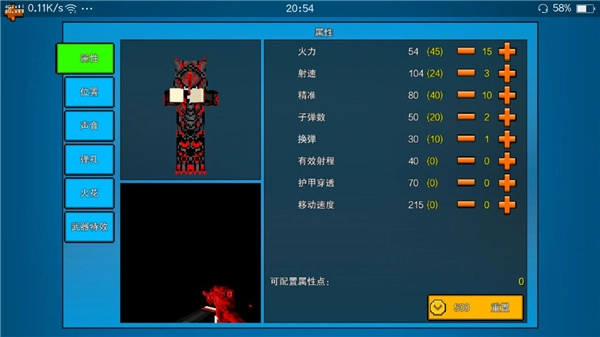 我们能够发现,总共有火力(单次射击伤害)、射击速度、精准度(准星尺寸)、弹匣容量、换弹速度(更换弹匣所需时间)、有效射击距离、护甲穿透能力、移动速率这八个属性可供分配点数。