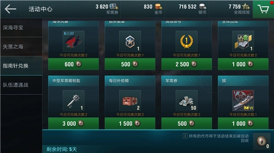 1、备受玩家喜爱的“失落之海”活动重磅回归,本周参加随机战或天梯赛即可根据战斗排名获得一定数量的指南针,指南针可用于兑换包括R系VIII级巡洋舰狨“狨”、军需券、高级账号等在内的诱人奖励!