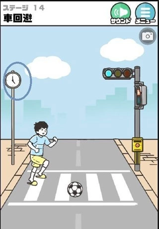 第十四关待小明走到马路中央时,点击左侧时钟暂停时间,再按红绿灯杆黄色按钮等到红灯亮起,再次点击时钟恢复时间过关