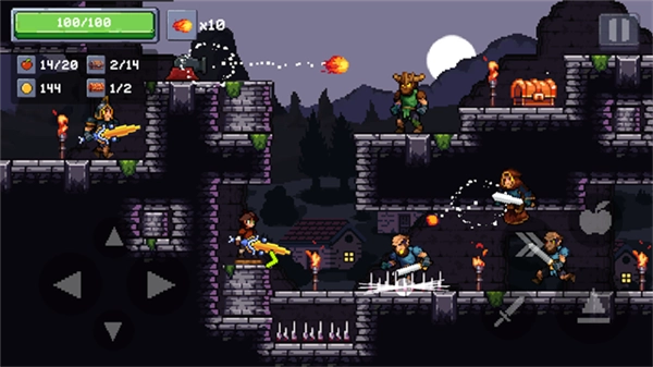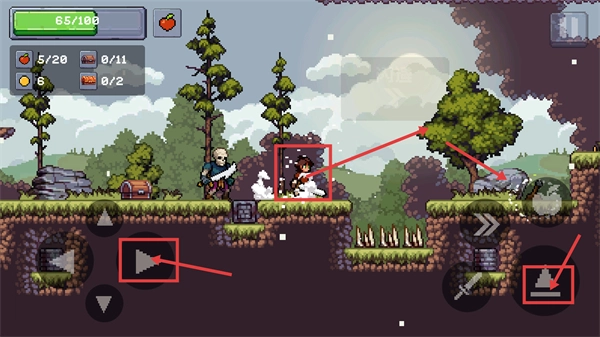 1、通过操控左侧按钮来移动角色,当靠近敌人后,点击右侧的攻击键就能击败敌人;还可以与场景里的宝箱互动以获取道具;要是遇到平台之间有落差的情况,点击右侧跳跃键即可完成移动。