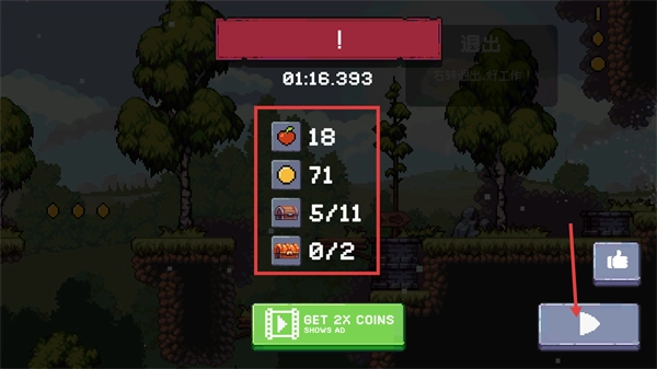 4、在结算界面可查看当前收集的苹果、金币、宝箱等道具进度,点击界面的播放按钮,即可继续推进游戏流程。