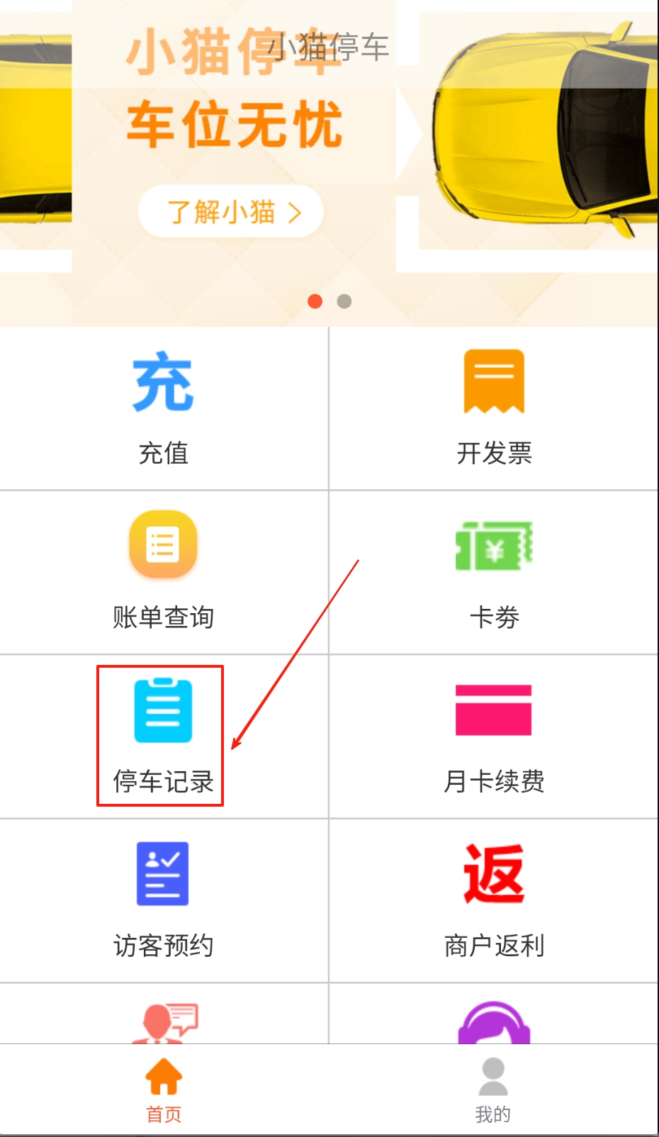 1、打开小猫停车应用,点击进入首页后,即可查看相关停车信息。