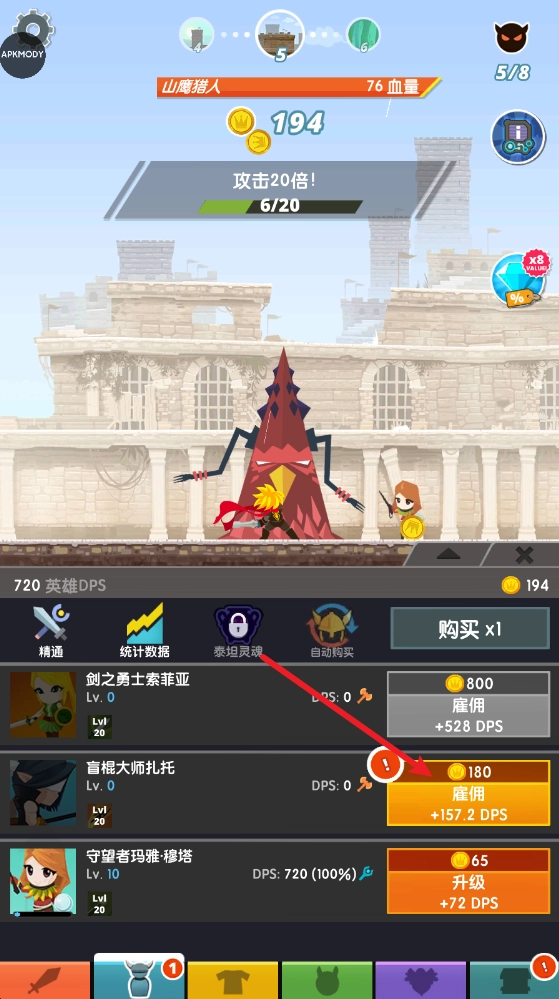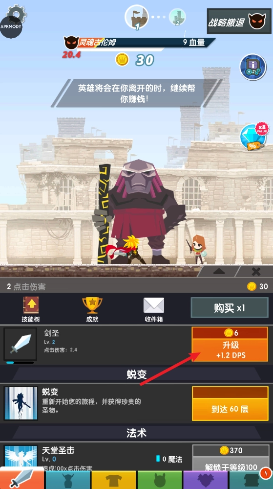 3、获取金币后,我们能够用于角色升级,从而提升战斗力。